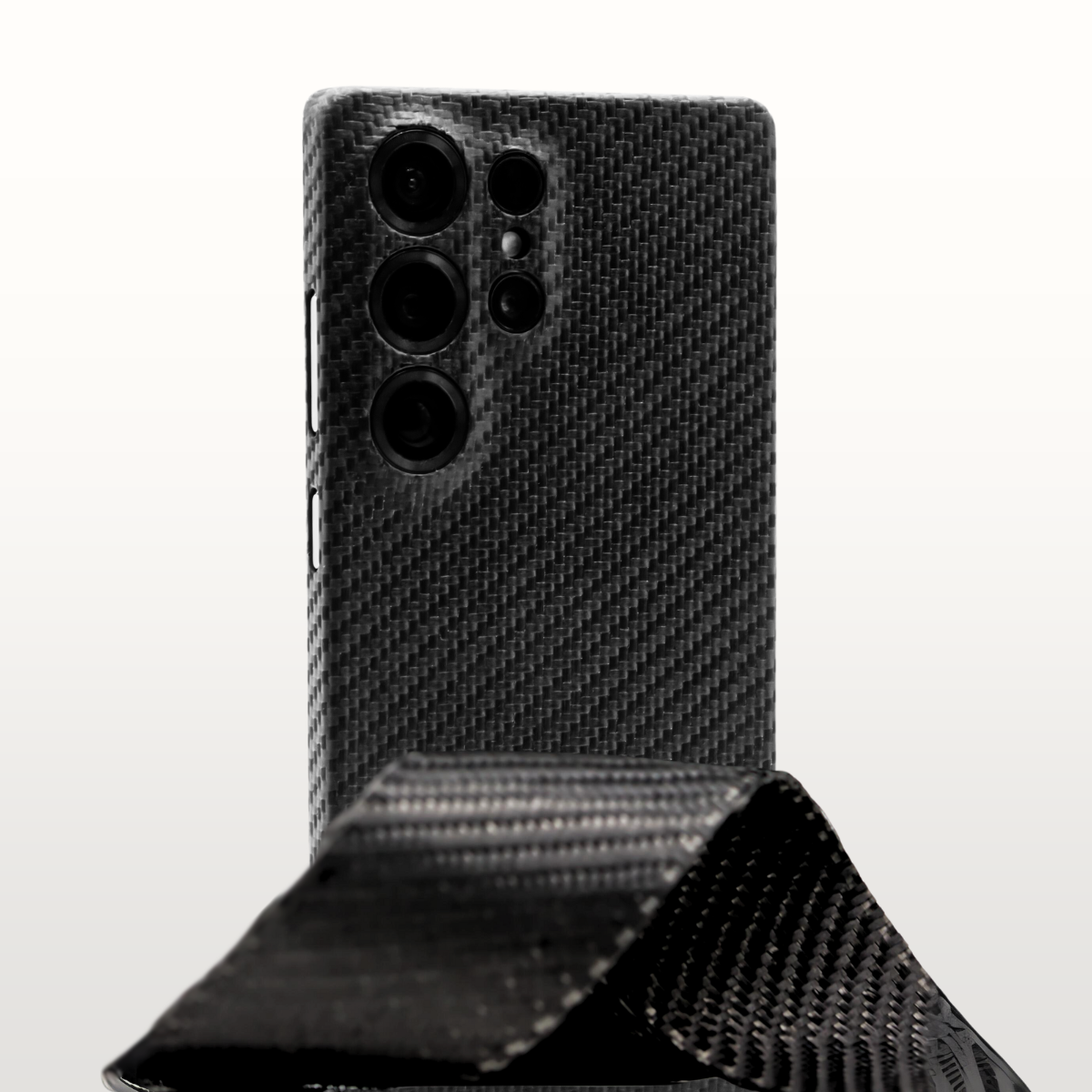 Nos housses sont composées à 100 % de carbone véritable. Ce sont des millions de minuscules fibres de carbone qui, une fois combinées, sont incroyablement résistantes tout en étant très légères. Le carbone est utilisé, entre autres, dans les avions, les vélos de course et la Formule 1.